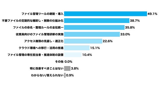 今後の改善策、担当者の約半数が「ファイル管理ツールの刷新・導入」を選択、「不要ファイルの棚卸し」や「ルール統一」が上位に