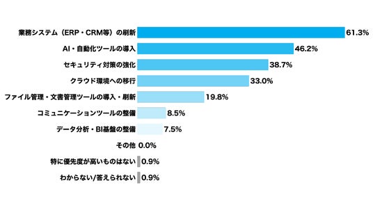 IT投資の優先テーマ、「業務システムの刷新」が61.3%でトップ、「AI・自動化ツール導入」も46.2%に上る