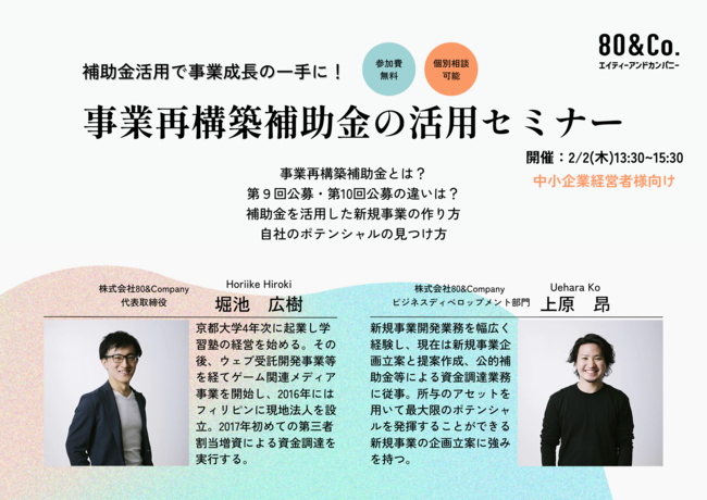 株式会社80&Company(本社:京都市左京区、代表取締役:堀池 広樹)は、石川県金沢市に新規拠点を開設したことをお知らせします。また、拠点開設記念に、「事業再構築補助金の活用セミナー」を2023年2月2日にオンラインにて開催します。中小企業経営者様向けで自社のポテンシャルの見つけ方から補助金について、新規事業の作り方まで幅広くお話しする予定なので、新規事業を少しでもご検討中の方はぜひご参加ください。申し込みURL:https://forms.gle/k6WxaaNANwjJBKREA