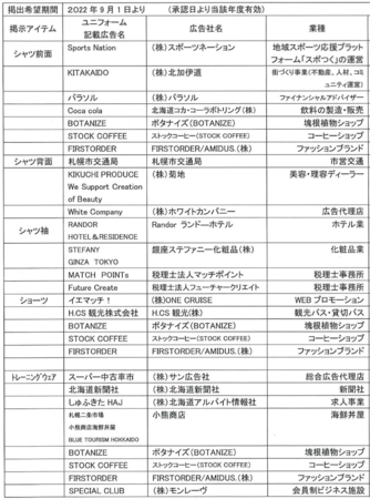 2022-2023年サフィルヴァ北海道公式ウェアパートナー一覧(ジャージ以外)