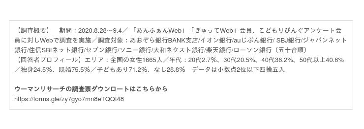 園児とママの情報誌「あんふぁん」「ぎゅって」を発行する株式会社こどもりびんぐ(所在地:東京都千代田区、代表取締役:中島一弘)は、 「シルミル研究所」としてリサーチ事業を展開しています。「シルミル研究所」では、全国の女性を対象にした調査「ウーマンリサーチ」を実施し、 女性が選ぶおすすめの商品やサービスをランキング形式で、Webコンテンツとして発信しています。今回は2020年8月~9月に実施した「インターネットバンキングについての調査」について発表いたします。