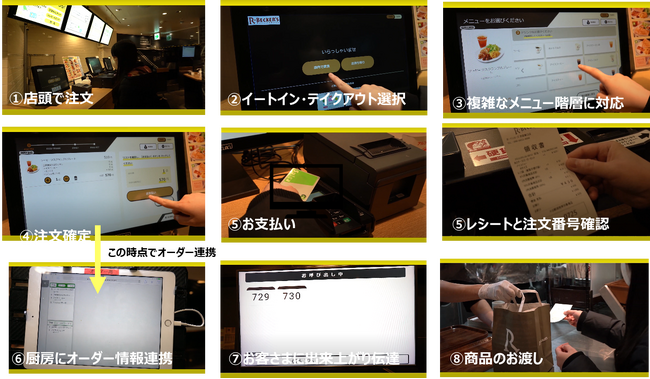 お客さまには、ご自身でメニューの選択や決済を行っていただきます。注文情報はタイムリーにキッチンに連携されるため、スタッフは、スムーズに画面で注文情報を確認、調理、ご提供が可能です。