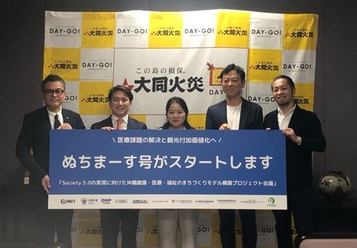 (写真:3月13日に大同火災海上保険株式会社にて行われた記者発表 左から大同火災海上保険株式会社 島田代表取締役専務、会議体 富樫代表、株式会社薬正堂 宮里代表取締役社長、MRT株式会社 小川代表取締役、株式会社琉球モビリティ 濱砂代表取締役社長)