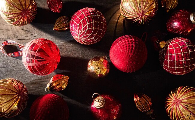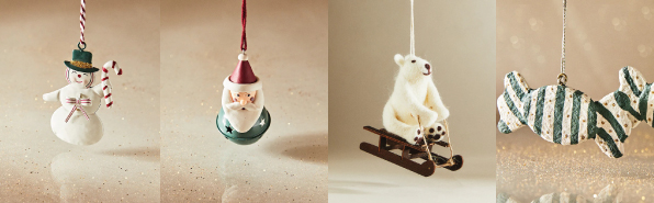 ツリーオーナメントにはレッド・ゴールド・シルバー・ブロンズなど、豊富なカラーを一堂にラインナップ。また、サンタクロースやベア、スノーマンなどのオーナメントも展開。おもちゃのようなかわいらしいオーナメントたちがクリスマスを盛り上げてくれます。