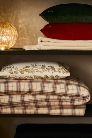 ベッドルームにはクリスマスカラーのクッションカバーやヒイラギ、スノーフレーク模様のデュベカバーなどを展開。クリスマスを基調としたデザインが大切な人との一年の締めくくりを華やかに彩ります。