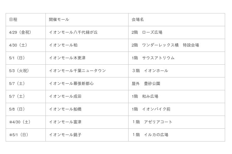 ※第一部のみ開催となります。 ※イオンモール富津、イオンモール銚子は対象外