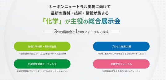 素材を中心としたテーマで国内外の産官学が集う「先端化学材料・素材総合展」と化学物質管理に関する専門展示会「化学物質管理ミーティング」、プロセス産業向けにDXを推進するためのサービスを紹介する「プロセス産業DX展」、さらには企業の産業安全を考慮する「産業安全フォーラム」によって構成されます。