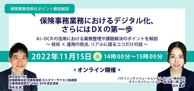 本セミナーでは、金融業界、なかでも保険業を中心として、社内のさまざまな事務業務のデジタル化、さらにはDX推進というテーマについて、パナソニックの「AI‐OCR/テクノロジー」の側面と、TMJの「運用/オペレーション」の両側面から解説いたします。