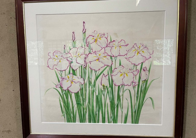 オリジナル花菖蒲・アジサイシーズン中、新設ギャラリー綵(あや)にて、加茂文子の残した花菖蒲とギボウシのアクリル画を展示します