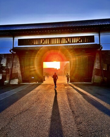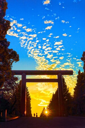 オレンジ色に美しく染まるうろこ雲、靖国神社の大鳥居の向こうに沈む夕日。チープな言い回しになってしまうことを承知の上で、「奇跡の一枚」と表現したい作品だと感じました。大村益次郎銅像と人影もアクセントに。