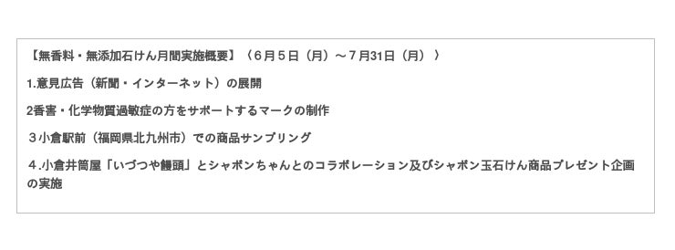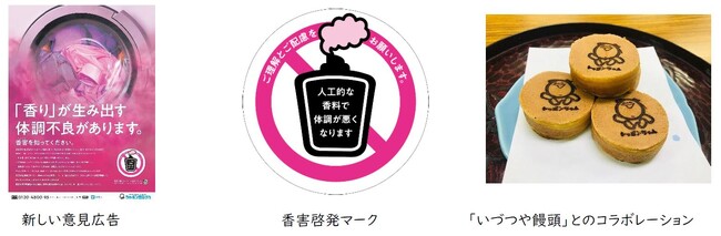 シャボン玉石けんは、2019年に「無香料・無添加石けん月間」を設定して以降、香害や化学物質過敏症ならびに無添加石けんの良さを啓発する活動を行ってきました。今回、アンケート調査で浮き彫りになった実態も踏まえ、より身近な問題として理解を広めるため、新たなグラフィックによる意見広告や香害・化学物質過敏症の方をサポートする「香害」マークを制作しました。また、小倉駅前(福岡県北九州市)での商品サンプリングや百貨店小倉井筒屋「いづつや饅頭」とシャボンちゃんのコラボレーション及びシャボン玉石けん商品プレゼント企画を実施いたします。