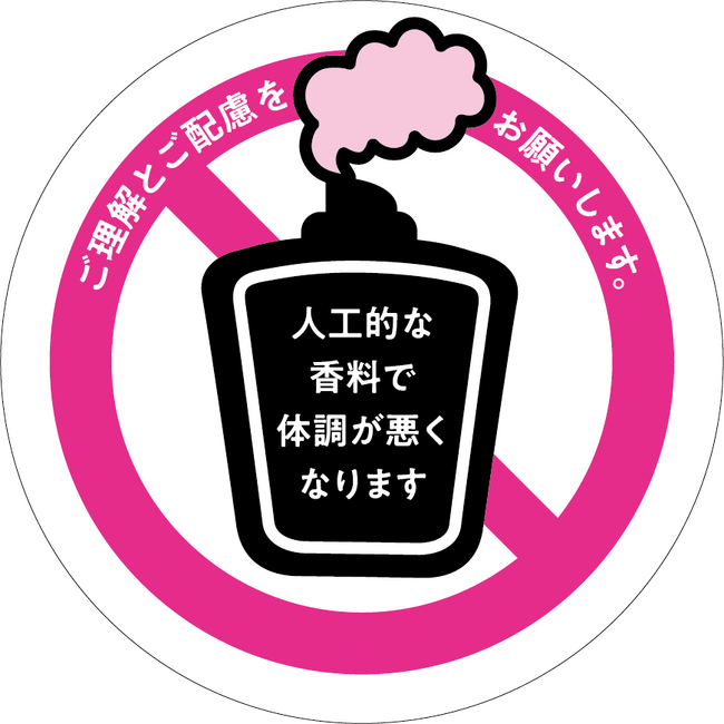 そこで、実際に香害で悩んでいる方が声をあげずともその実態を周知しやすくすることを目的に、「香害啓発マーク」を制作いたしました。本マークはHPよりダウンロード可能で、希望者にはステッカーを配布予定です。