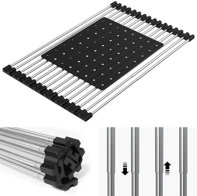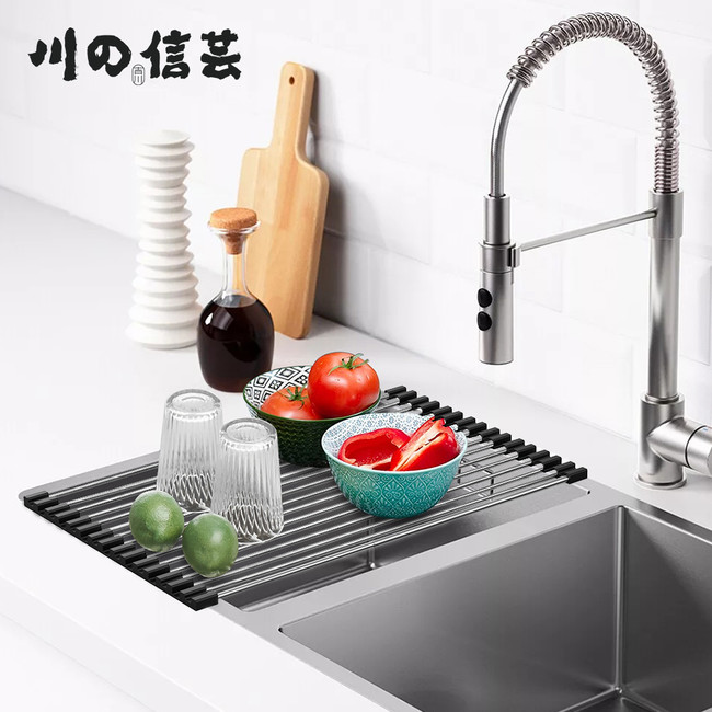 【折りたたみ式・伸縮可能】:約33-59cmの範囲に伸縮自在で、どんなシンクにも合います。シンクの幅に合わせて、両手でステンレス棒の長さを調節して設置します。使用しないときはくるくる丸めてコンパクトに収納可能です。