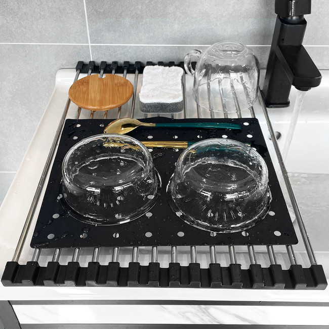 【安定性抜群】:両端のシリコンキャップは四角い形状をしているため、普通の丸形状より安定性が良いです。ステンレス棒の上に水切り穴付きのシリコンマットが敷かれて、その上にのせた食器が滑りにくく、水が速く切れます。