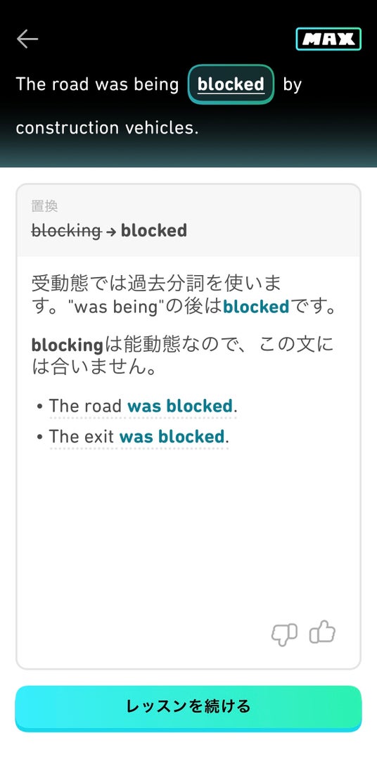 - スマート解説:レッスンの大部分の問題形式において、文脈に応じた解説を自動で生成し、ユーザーに対してなぜ自分の回答が間違いであったかを解説します。