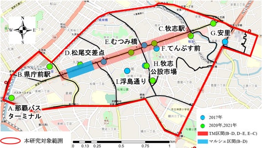そこで本研究は、1.地点別訪問率、2.観測地点数、3.滞在時間、4.通過時間の4つを評価指標として設定するとともに、IoTデバイスデータ、具体的にはWi-Fiパケットセンサーのデータに着目、これを用いた人流計測手法により、沖縄県那覇市中心市街地を対象に行われた活性化施策の効果を明らかにすることを目的に行われた。