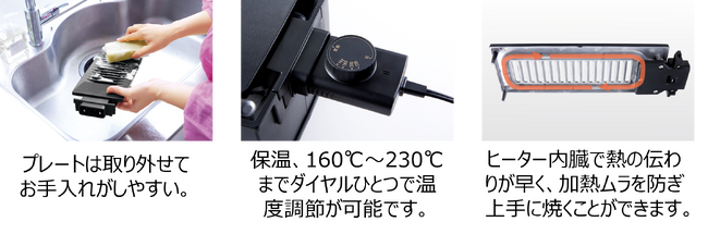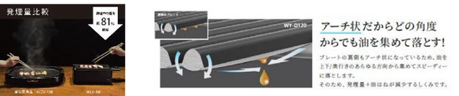 また、自宅で焼き物をする際に厄介となるのが、煙です。『DINING炉端』は、発煙量は約81%軽減(※)、フッ素コートで焦げ付きにくいなど自宅で扱いやすいような工夫がされています。さらに、安全ロック機構を採用しており、プレートを本体に置いたときに温度調節器が差し込めるようになっているため、本体にセットしない状態でプレートを温めてしまう心配がございません。発煙量を軽減する秘密はピーコック魔法瓶独自の3次元アーチ構造を採用したことにあります。プレートの裏側もアーチ状にすることで、油を一か所に集めて落とし発煙量と油はねを減少させます。