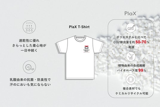 本イベントで採用されたTシャツには、綿とPlaXを組み合わせた※混紡素材を使用しています。天然素材の風合いを活かしながら、PlaXの特長である機能性を付加することで、快適な着用感を実現しています。