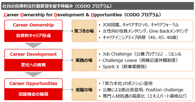 具体的には、「気づきの場」、「実践の場」、「活躍の場」を有機的に提供することで、社員の「自律的な行動変容」を促すことを目的とした、「行動変容プログラム(Career Ownership for Development and Opportunities、“CODO”)」を展開しています。