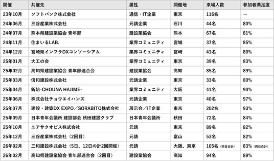 開催当初は単独開催が中心でしたが、地域の建設業協会や元請企業、業界コミュニティとの共同開催へと展開を広げることで、これまで参加が難しかった地域の建設会社にも参加機会を提供できるようになりました。