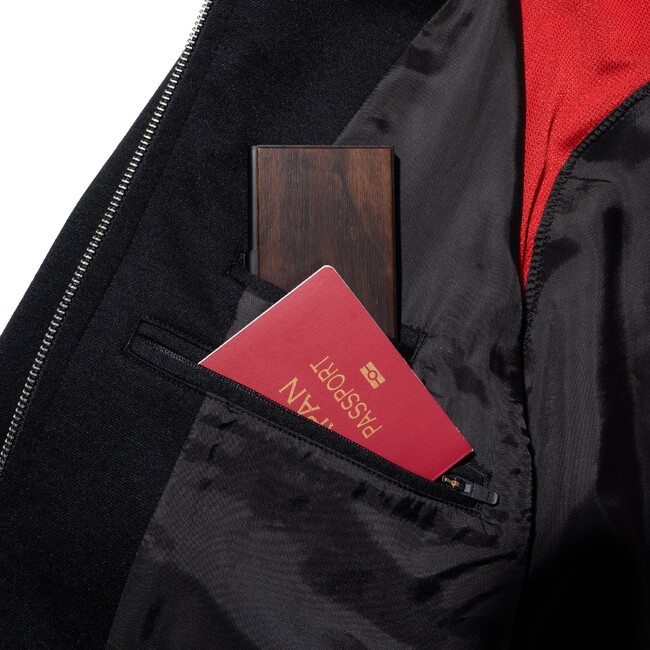 たとえばジャケットには、スマホポケット、名刺ポケット、ウォレット/パスポートポケット、ペン差しなどを配置。可能な限りシルエットに影響しないよう考え抜かれた機能的ポケットが、旅や出張を快適なものに変えます。
