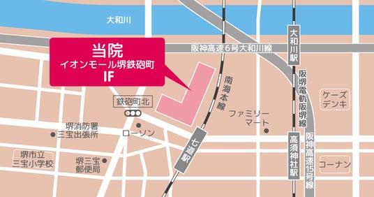 南海本線「七道」駅より徒歩約3分、阪堺電気軌道阪堺線「大和川」駅より徒歩約8分、阪堺電気軌道阪堺線「高須神社」駅より徒歩約9分の「イオンモール堺鉄砲町」1階で、朝9時から夜21時まで、土日祝日も毎日診療を行います。