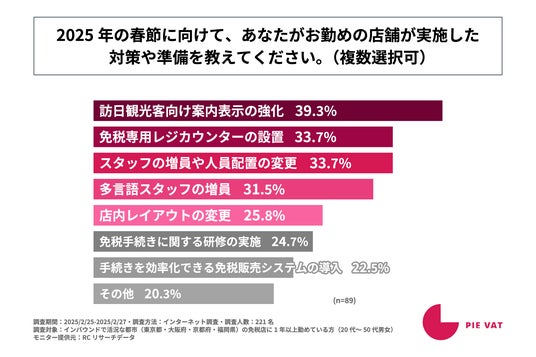 調査の最後、2025年の春節に向けて何らかの免税手続きに関する対策や準備を行ったと回答された方に「2025年の春節に向けて、お勤めの店舗が実施した対策や準備」を尋ねる設問への回答では、1位が「訪日観光客向け案内表示の強化」で39.3%、2位が同率で「免税レジカウンターの設置」と「スタッフの増員や人員配置の変更」で33.7%という結果になりました。また4位以降も回答率20%以上の回答が複数続く形となり、春節に向けた対策や準備は様々行われていた、ということがわかりました。