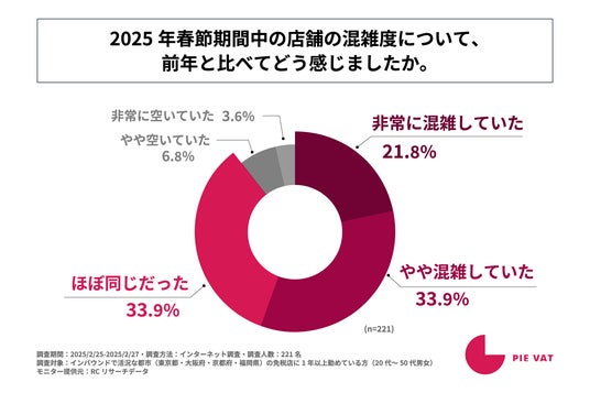 株式会社Pie Systems Japan(本社:東京都中央区、CEO:水野 博商)は、本社であるPie Systems Inc.(本社:カリフォルニア州、CEO:Sunny Long)の日本法人です。今回、同社が運営する免税手続きアプリ「PIE VAT」は、インバウンドで活況な都市(東京都・大阪府・京都府・福岡県)の免税店に1年以上勤めている方を対象に「2025年春節期間の免税店実態調査」を実施しました。この調査結果から、2025年の春節期間中の免税店の状況等が明らかになりました。