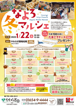 やわらぎ斎場名寄(北海道名寄市徳田240番地1)で、一日限りの『なよろ冬マルシェ』を1月22日(日)に開催いたします。焼き鳥やコロッケ、からあげなどのグルメ、ガラスアクセサリーや織物、ソープカービング、ヘッドマッサージなど、幅広いジャンルのお店が大集合!あなただけのお気に入りのアイテムを見つけてください。