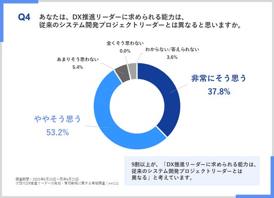 「Q4.あなたは、DX推進リーダーに求められる能力は、従来のシステム開発プロジェクトリーダーとは異なると思いますか。」(n=111)と質問したところ、9割以上が従来の能力とは異なる(「非常にそう思う」が37.8%、「ややそう思う」が53.2%)と回答しました。