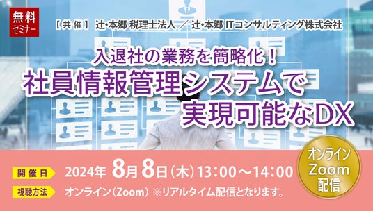 辻・本郷 ITコンサルティング株式会社(本社:東京都渋谷区、代表取締役社長:黒仁田 健)は、辻・本郷 税理士法人(本社:東京都新宿区、理事長:徳田 孝司)と、8月8日(木)に無料セミナー「入退社の業務を簡略化! 社員情報管理システムで実現可能なDX」を共催します。