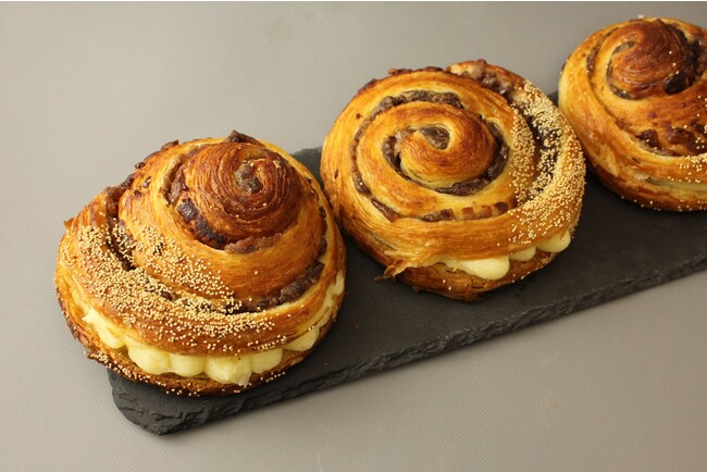 サクッとしたデニッシュに小倉餡を巻き込み焼き上げ、クリームチーズフィリングをサンドしました。クリームチーズの酸味に溶け合うバターのコクと練乳の優しさが、魅惑的な甘さを引き出します。あんことお酒の挑戦的なペアリングは、日本酒と合わせてスキッと味わうのも良し、あんこと相性抜群のミルクを使ったホットカクテルでまったりするのも良し、楽しみ方は無限大です。