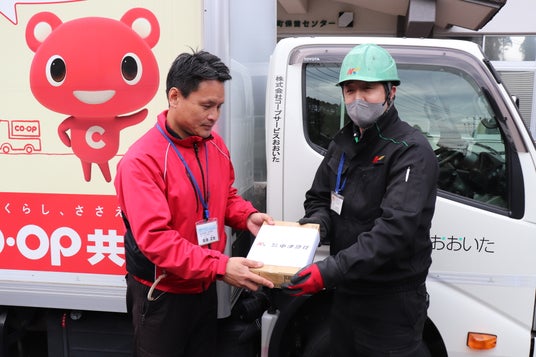 同じ宛先の荷物を混載するため、中津急行が配送する宅配荷物をコープおおいたのスタッフに手渡しする中津急行の配送ドライバー(宇目保健センター)