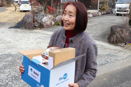 自宅前にドローン配送された荷物を受け取る矢野美代子さん