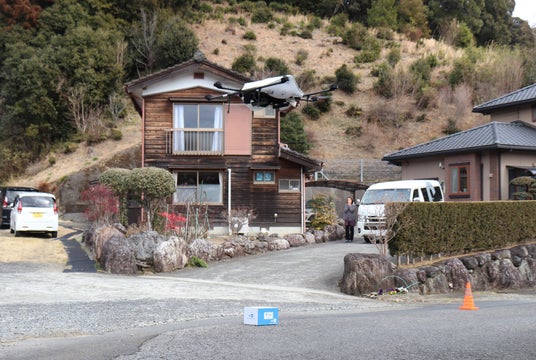 2月13日の報道関係者への公開では、宇目保健センターをドローンデポと想定し、宇目保健センターにコープサービスおおいたの荷物と宅配荷物を想定した荷物を集約し、さらに宇目保健センターから個人宅までの片道約5km・約13分を、2つの荷物を混載してドローン配送しました。エアロネクストが開発した物流専用ドローンAirTruckを使用し飛行レベル3.5の自動遠隔運航による飛行を実施しました。