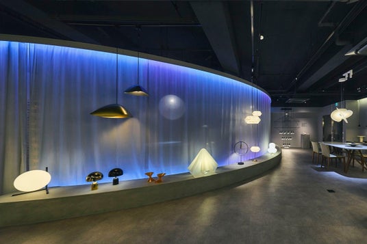 ショールーム全体を包むカーテンの間接光には、展示照明(電球色)を引き立てる補色として青を基調としたカラーライティングを採用。光を半分だけ透過する上質な素材のカーテンを2枚重ねることで、奥の展示照明の存在をほのかに感じさせながら、カラー光が美しくのる幻想的な効果を実現しています。