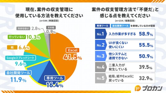 2025年10月1日に当社で発表した「案件収支管理の実態調査※」では、案件収支管理方法として「Excel」が最多という結果になりました。また、ツールを使用している企業でも半数以上が「入力作業の多さ」「使いにくいUI」「他システムとの連携不足」などとを不便に感じており、ツール導入だけでは十分な効率化につながっていない現状が明らかになっています。