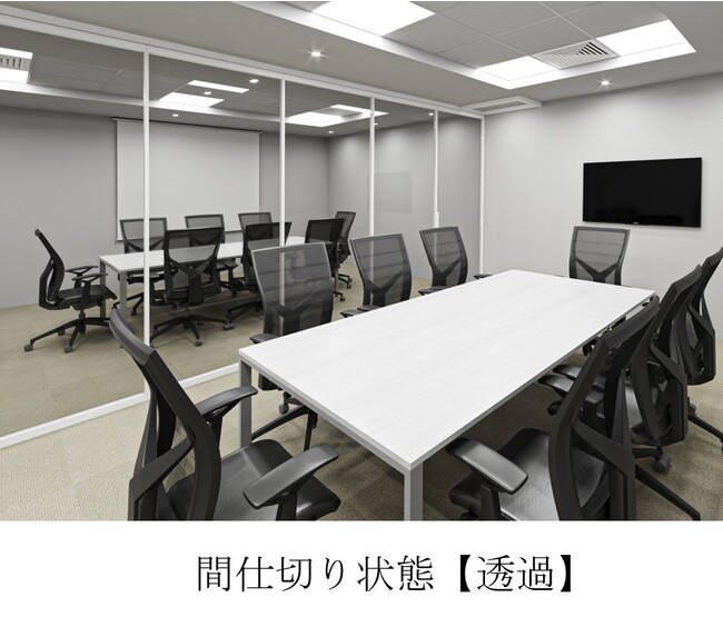 耐熱性・透明性に優れたポリカーボネート素材の特長を活かし、移動式のパーティション(建築引き戸)に調光機能を搭載。ガラスより約50%軽く、レール上を自由に動かせるので、用途に合わせてお部屋のレイアウト変更を簡単に行えます。