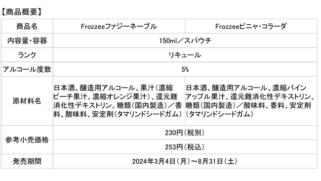 大関株式会社(社長:長部訓子/兵庫県西宮市)は、2023年3月に日本酒ベースのフローズンカクテル「Frozzeeファジーネーブル150mlスパウチ詰」「Frozzeeピニャ・コラーダ150mlスパウチ詰」を期間限定で発売を開始し、大変ご好評を頂きました。再販のご要望にお応えし、2024年3月4日(月)から期間限定で再発売します。