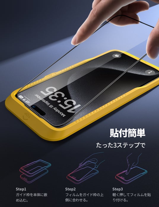 このiPhone 16ガラスフィルムはスマホ本体の右サイドのボタンを再現した可動ノッチを設置した特別なガイド枠が同梱されています。貼付中に画面がロック解除してしまっても、ガイド枠を外さなくてもロックボタンを押せます。ガイド枠の素材はABS(合成樹脂)で、スマホに傷をつけない素材なのでご心配せずにお使いください。OCA層、PET層などのスペシャルな素材で構成したABテープでフィルムが自動吸着できるので、初心者でも簡単に貼り付けられます。まず、ガイド枠をしっかりと本体にはめ込みます。次に、ガラスフィルムをスマホの上部に合わせ、ゆっくりと下げます。そして、軽く押せば、自己吸着層で気泡も浮きもなく、画面に溶け込んでいくように張り付きます。