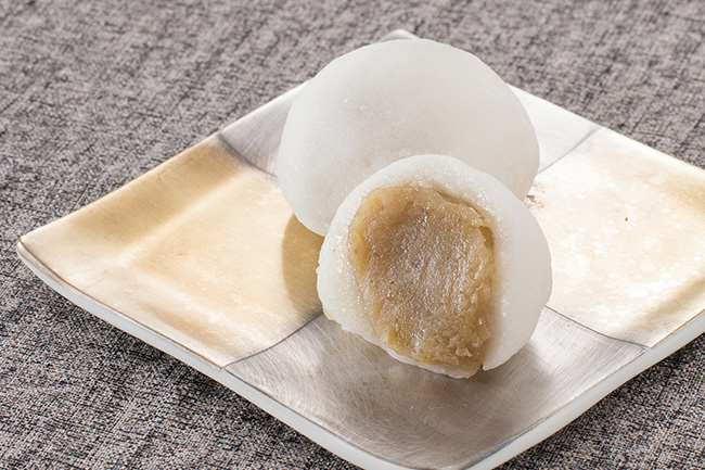 もちもちの大福の中になめらかな栗きんとん餡をたっぷりと詰め込みました。