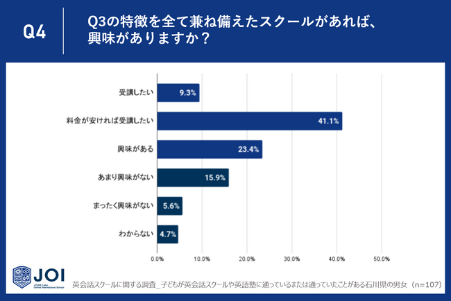 Q4で「Q3の特徴を全て兼ね備えたスクールがあれば、興味がありますか?」と質問したところ、石川県では9.3%が受講を希望し、41.1%は料金が手頃であれば受講したいと考えています。さらに、23.4%は興味を示していると回答しました。多くの人がこのような特徴を持つスクールに一定の興味を示していることが分かります。