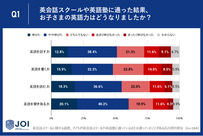 じゅけラボOnlineインターナショナルスクールJOIは、子どもが英会話スクールや英語塾に通っているまたは通っていたことがある石川県の男女164人に、英会話スクールや英語塾の効果に関するアンケート調査を実施しました。