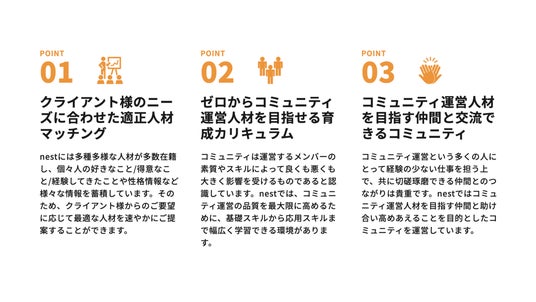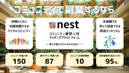 昨今、企業のマーケティング活動としてSNSマーケティングに加えコミュニティマーケティングが重要視され、コミュニティ運営人材のニーズが高まっています。nestではコミュニティ運営人材の育成から、仕事のマッチングまで一気通貫で提供し、「コミュニティ運営で稼ぐ」人材を創出します。