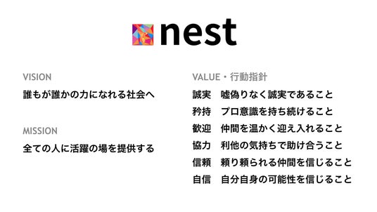 nestでは、企業理念のようにコミュニティ理念を掲げており、仲間とつくるカルチャーを大切にしています。