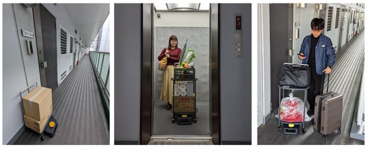 左:各部屋への宅配物の搬送 / 中:エレベーターと連携し、ロボットが住人の買い物荷物を部屋まで自律搬送 / 右:各部屋からロビーへの荷物運搬(ゴミ出しや旅行バック等)をサポート