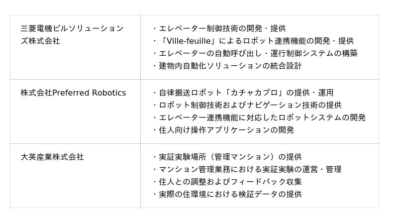 本実証実験は、三菱電機ビルソリューションズのIoTプラットフォーム「Ville-feuille(ヴィルフィーユ)(R)※1」を活用した「ロボット移動支援サービス」により、Preferred Roboticsの自律搬送ロボット「カチャカプロ」とエレベーターを連携させ、大英産業が運営・管理するマンション内で建物内移動の効率化と自動化の可能性を検証するものです。日常生活の主な利用場面は、買い物、ゴミ出し、宅配受取、重量物の搬入など生活に直結した場面を想定しています。
