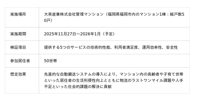 三菱電機ビルソリューションズ株式会社(取締役社長 織田 巌、本社:東京都千代田区)、株式会社Preferred Robotics(代表取締役CEO 礒部 達、本社:東京都千代田区)、大英産業株式会社(代表取締役社長 一ノ瀬 謙二、本社:福岡県北九州市八幡西区)は共同で、居住者が生活するマンションにおいて、自律搬送ロボットがエレベーターと連携してロビーと各部屋間で荷物やカートの搬送などを行うシステムの実証実験を2025年11月27日に開始し、2026年1月まで実施する予定です。