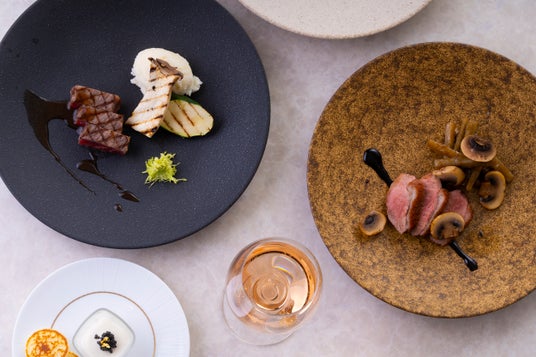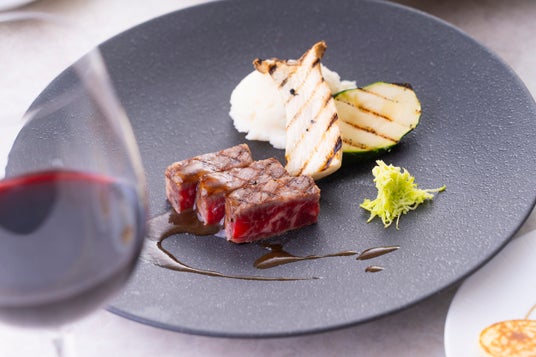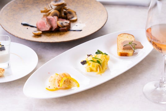 料理は主に静岡産の食材を中心にセレクトされたフレンチコースディナー。ワインの香りと味わいをより一層引き立てる食材選びから繊細な調理法など、こだわりの詰まったコースです。ヴァンブランソースには、自社の白ワイン、葵牛のソースには自社の赤ワインを使用。ワインとのペアリングとともに、料理そのものにも組み込まれたワインの香りや味わいもお楽しみ いただけます。