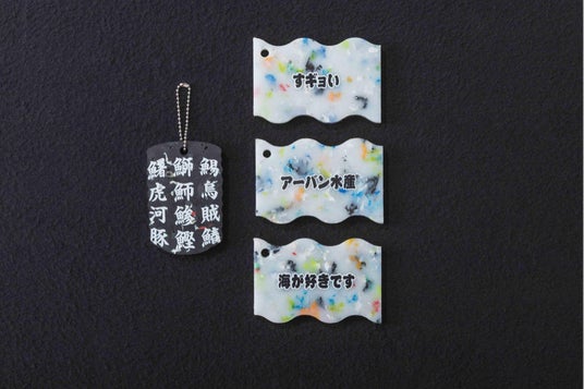 REMAREは、漁具をはじめとする海洋ごみ由来のアップサイクル板材を用いてキーチャームを制作しました。